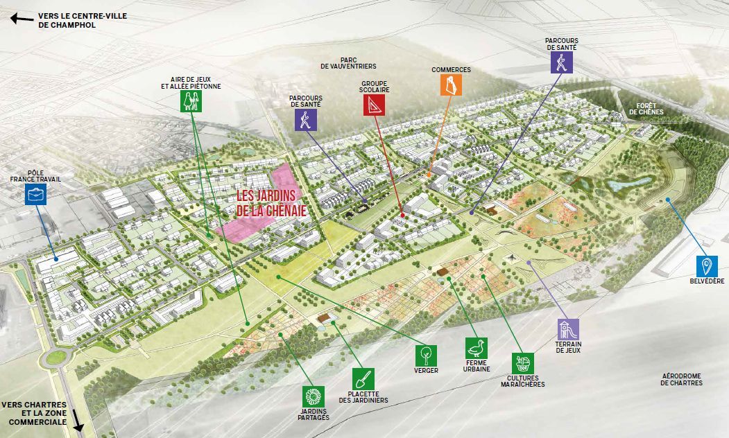 Le centre de Chartres se rejoint facilement, avec les bords de l'Eure à 6 minutes de voiture, la cathédrale ou la gare à 11 minutes. Une ligne de bus, qui passera avenue de la Chênaie, sera connectée à l'ensemble du réseau chartrain.